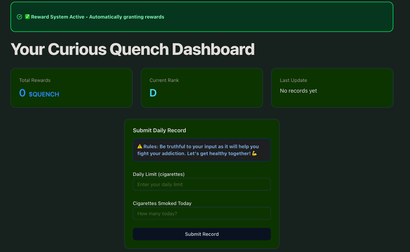 Curious Quench is a web3 application designed to help smokers quit the habit. Users track daily cigarette consumption, set daily limits, and earn $QUENCH tokens based on their progress through a rank system that rewards better performance. The platform provides transparent onchain tracking of daily submissions and token rewards, with real-time notifications that deliver instant feedback when users earn $QUENCH tokens for staying below their daily limits. The gamified approach turns behavioral health tracking into measurable, verifiable progress where achievements are recorded on the blockchain and rewarded with tokens.