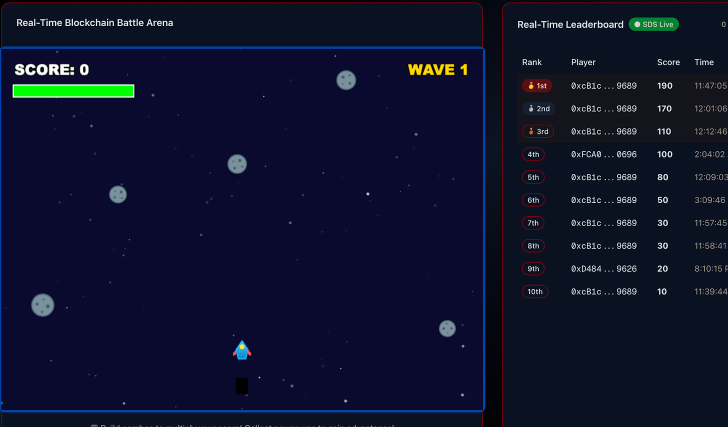 Battle Arena is a real-time multiplayer space shooter that uses Somnia Data Streams to create instant leaderboard updates, live achievement tracking, and spectator mode capabilities. The game features an ERC721 NFT system with dynamic score-based NFTs and rarity tiers, onchain leaderboards with gas-efficient management, and champion rewards with achievement unlocks. Battle Arena uses SDS subscriptions to eliminate the 5-15 second delays and constant API polling that create poor user experiences in traditional blockchain applications.