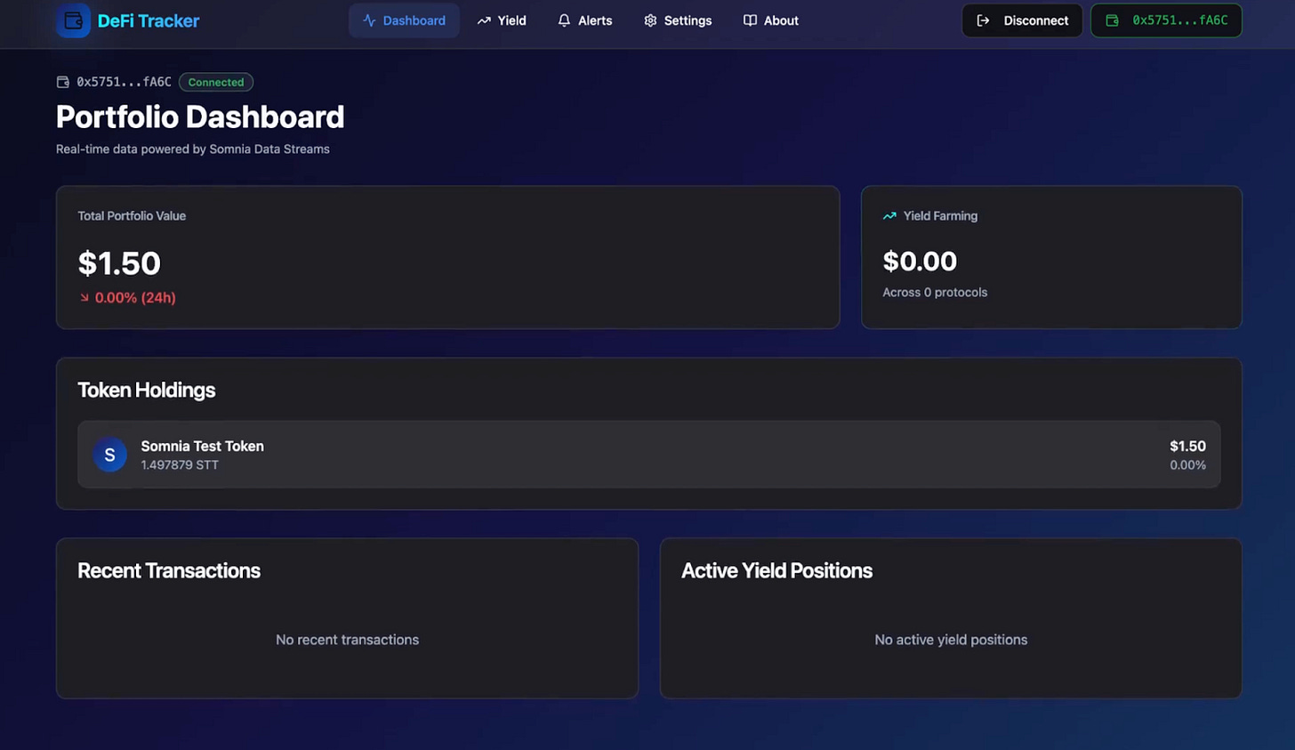 DeFi Stream Insight is a monitoring dashboard for DeFi portfolios that uses Somnia Data Streams to provide real-time token balances, yield performance tracking, and transaction flows from connected wallets. The platform offers live portfolio value updates, real-time transaction streaming, staking position monitoring with reward tracking, and price alerts that trigger based on real-time updates. DeFi Stream Insight demonstrates how Data Streams can power the instant portfolio visibility and transaction monitoring that DeFi users need without the polling delays of traditional dashboard applications.
