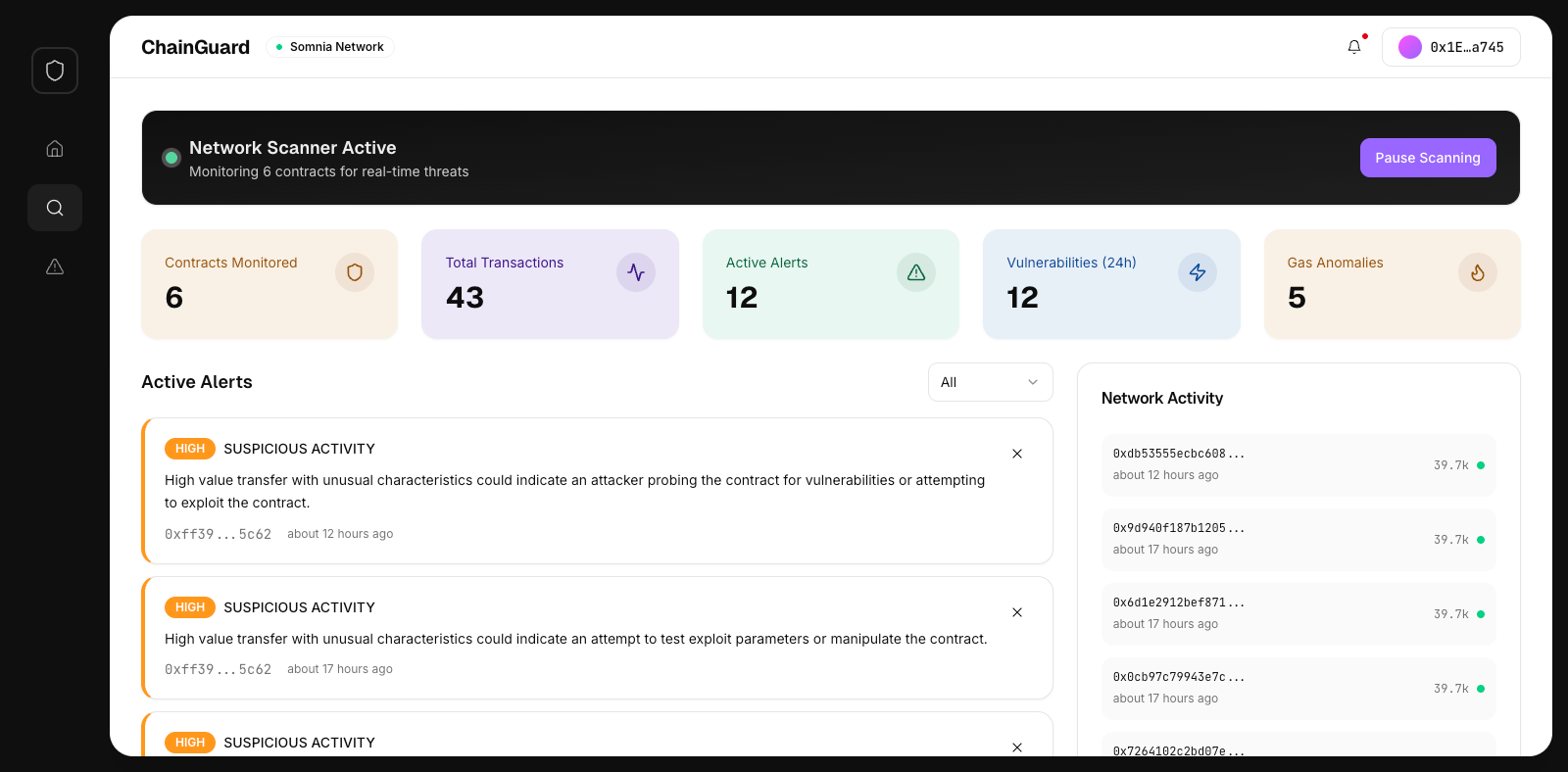The system combines behavioral detection with AI validation through Gemini API to classify exploits and assign confidence scores, providing a real-time dashboard with WebSocket-driven updates that shows live risk feeds, historical insights, and contract watchlist management. By using Somnia Data Streams to monitor Somnia’s high transaction throughput and detect multi-step attacks as they unfold, ChainGuard demonstrates how SDS can power security infrastructure that reduces exploit detection time from hours to seconds for DeFi protocols building on the network.