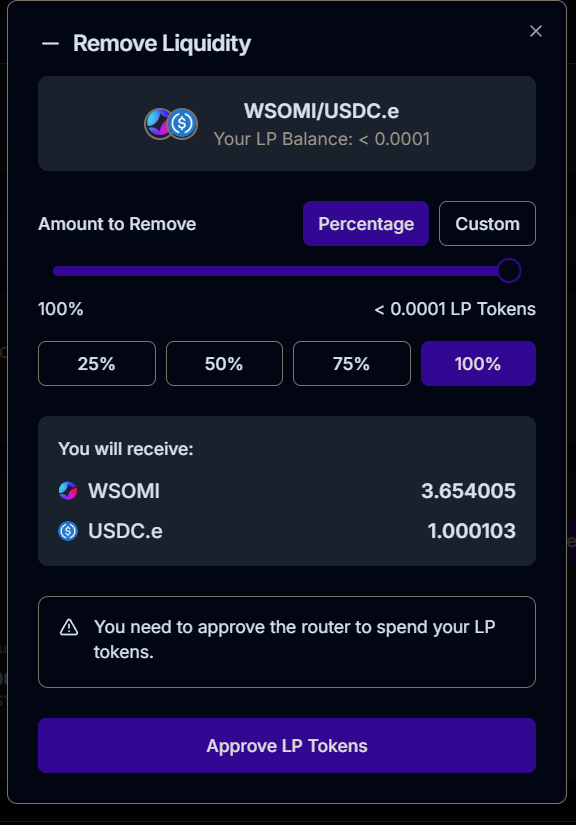 Current Reserves shows how much of each token is already in the pool. In the example above, the pool contains 307,439 SOMI and 84,009 USDC.e. Larger reserves generally mean more stable pricing and lower slippage for traders.